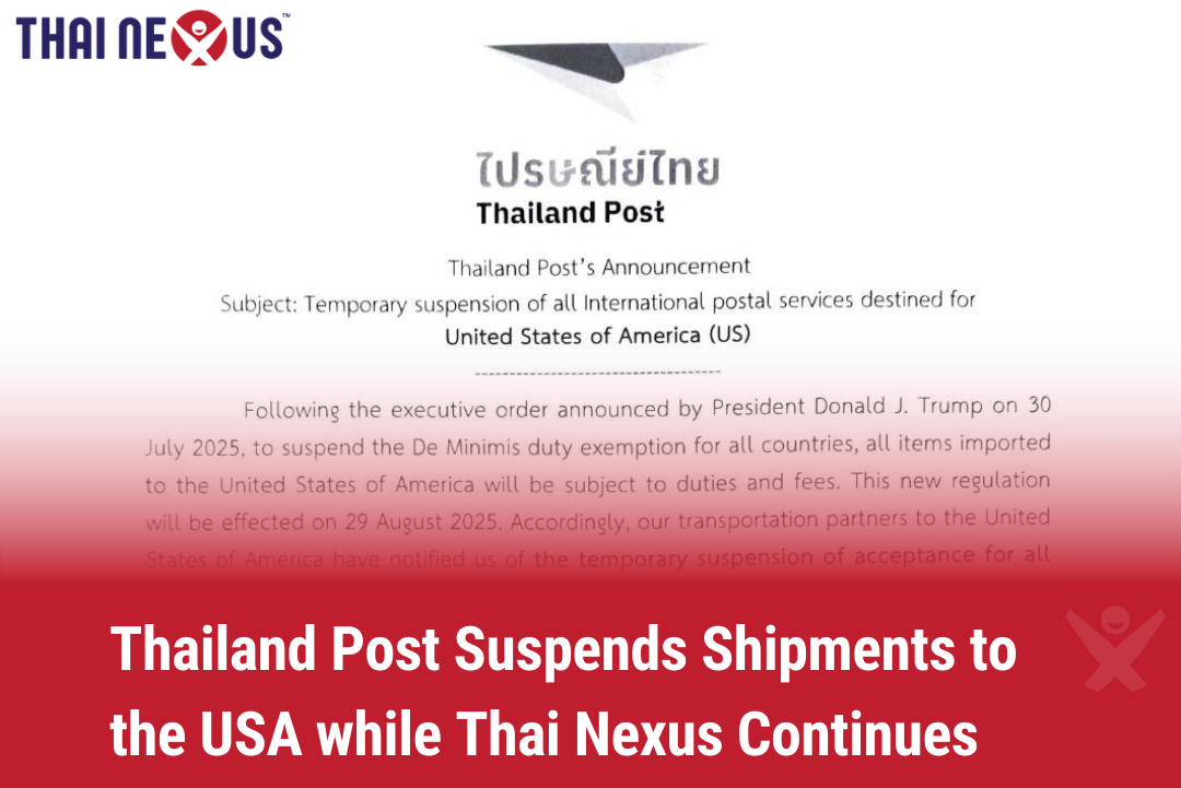 Through its Thai Nexus Express service, shipments to the United States will continue without interruption. Even better – Thai Nexus Express already includes all taxes and duties in its shipping rates. That means no hidden surprises, no rejected packages, and no sudden costs upon delivery.
