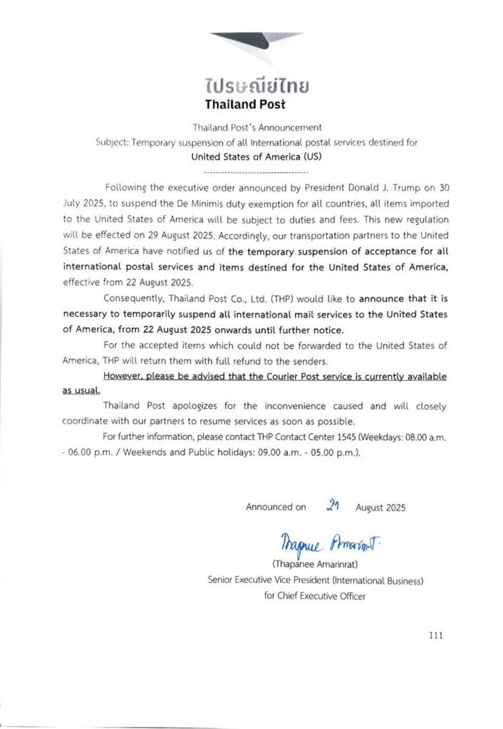 Thailand suspended all postal shipments to the USA starting 22 August 2025 due to new U.S. regulations removing the duty-free exemption. Every package entering the U.S. is now subject to duties and fees.