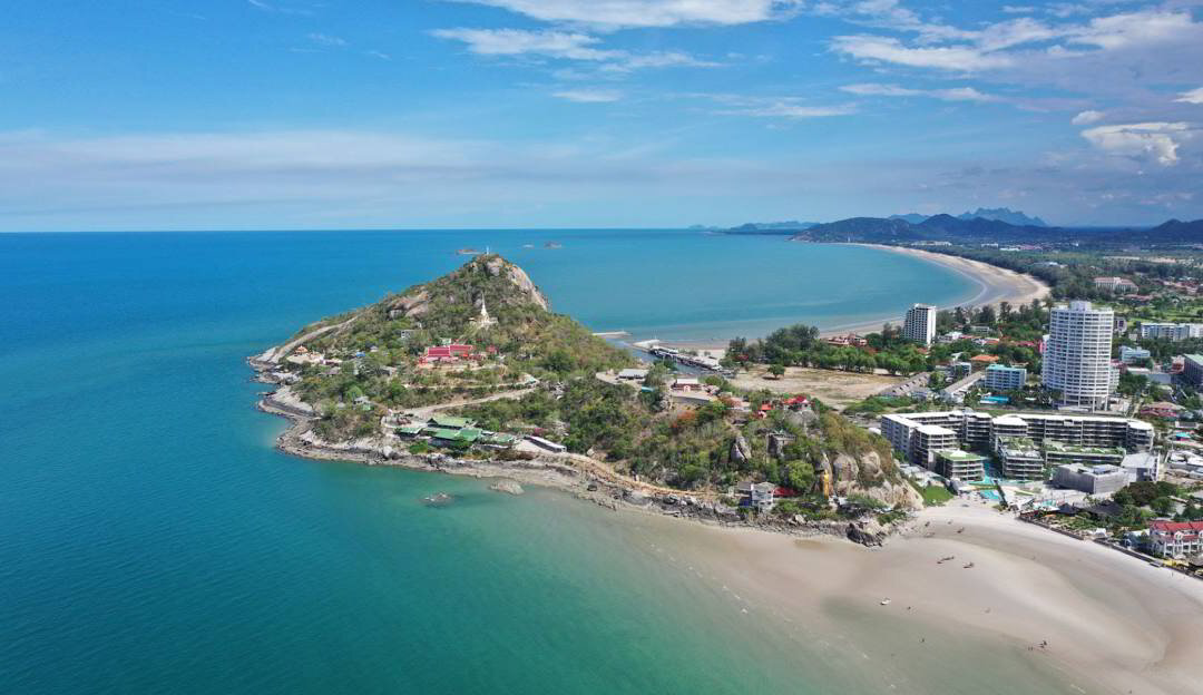 Panoramic view of Hua Hin city featuring high-rise resorts, golden beaches, ocean views, and lush hills — highlighting top travel experiences in Hua Hin, Thailand.
